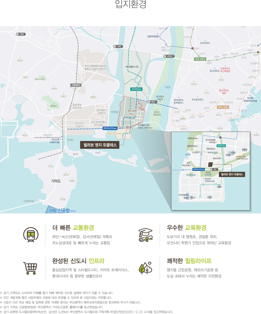 부산신항과 명지IC 을숙도대교 등을 통해 서부산 산업벨트와 부산 도심 주요 권역으로 이동이 수월하며 향후 강서선과 하단녹산선 등 교통망 확충이 예정되어 있어 장기적으로 더 나은 광역 접근성을 기대할 수 있습니다.